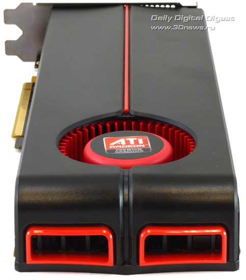 В верхней части платы расположены разъёмы питания видеокарты (требуется подключение двух 6-ти контактных разъёмов питания PCI-Express). Кроме того, не трудно заметить разъемы для объединения нескольких видеокарт AMD Radeon HD 5870 в CrossFireX связку.